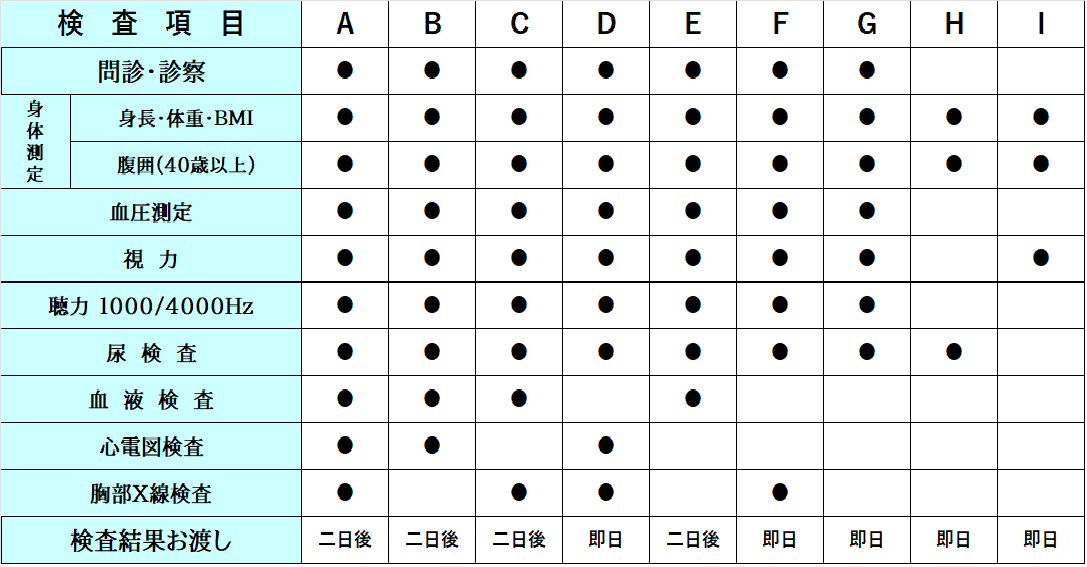 下記の健診検査項目一覧表を参照 ( 検査項目 A・B・C のいずれか ) |